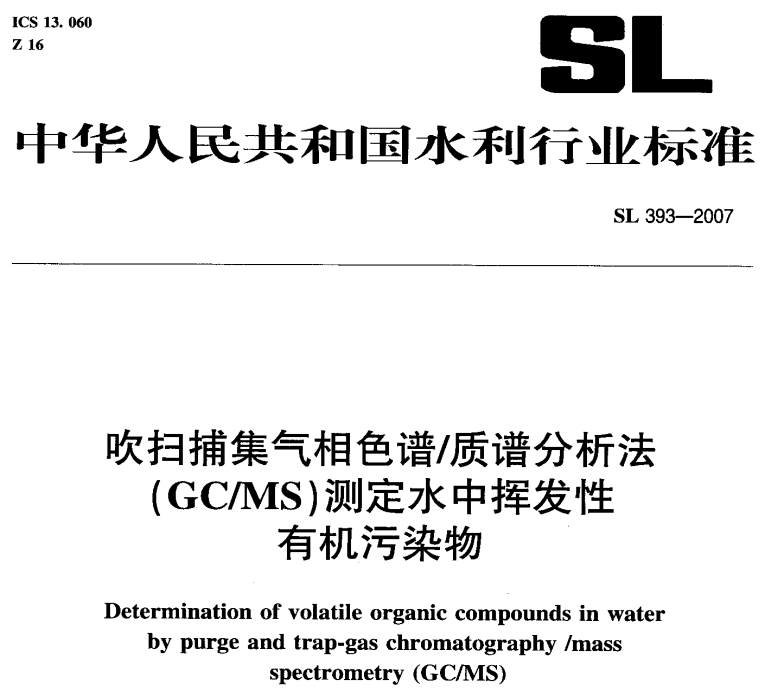 SL 393-2007 吹掃捕集氣相色譜-質(zhì)譜分析法(GC-MS)測定水中揮發(fā)性有機污染物 SL 393-2007 吹掃捕集氣相色譜-質(zhì)譜分析法(GC-MS)測定水中揮發(fā)性有機污染物本標準適用... 更新日期:2020-05-06 下載包(1)