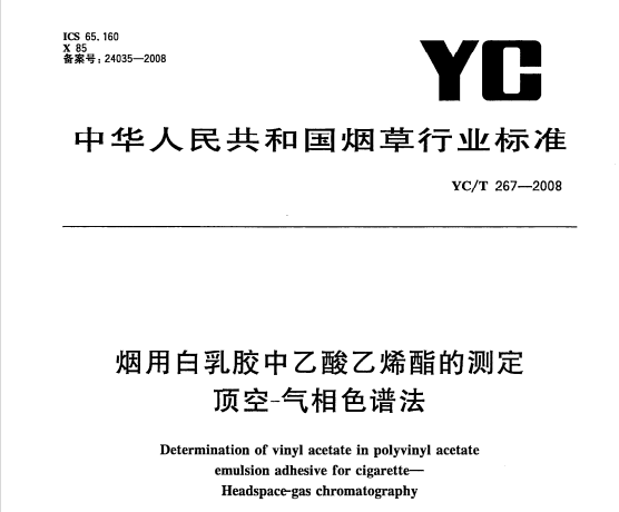 YCT 267-2008 煙用白乳膠中乙酸乙烯酯的測定頂空-氣相色譜法 YC/T267-2008煙用白乳膠中乙酸乙烯酯的測定頂空-氣相色譜法 本標(biāo)準(zhǔn)規(guī)定了煙用白乳膠中乙... 更新日期:2020-05-09 下載包(1)