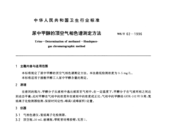 WST 62-1996 尿中甲醇的頂空氣相色譜測(cè)定方法 本標(biāo)準(zhǔn)規(guī)定了尿中甲醇的頂空氣相色譜測(cè)定方法.本法最低檢測(cè)濃度為0.5mg/L.本標(biāo)準(zhǔn)適用于接觸甲醇工... 更新日期:2020-05-09 下載包(1)