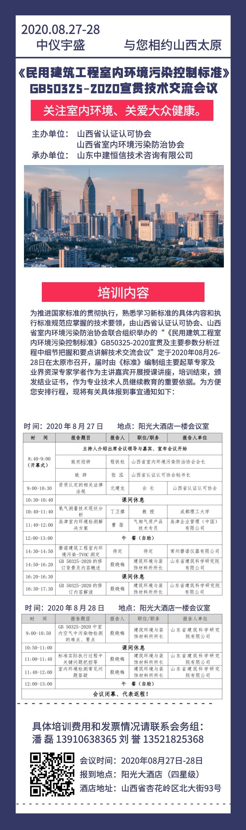關(guān)注室內(nèi)環(huán)境、關(guān)愛(ài)大眾健康。相約太原!《民用建筑工程室內(nèi)環(huán)境污染控制標(biāo)準(zhǔn)》GB50325-2020宣貫技術(shù)交流會(huì)議 更新日期:2020-08-26